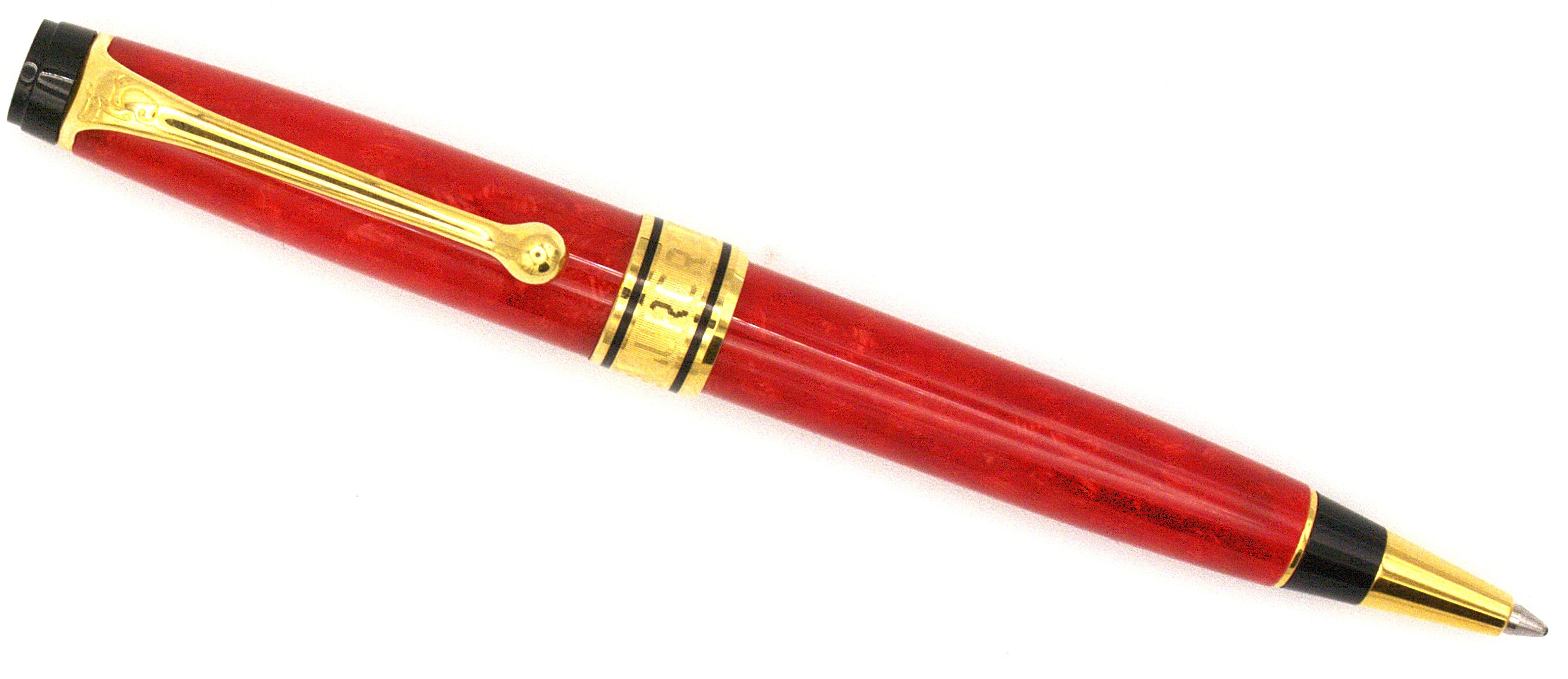 Fusto in resina di colore rosso brillante effetto marmorizzato, base del cappuccio in metallo dorato ornato ad elementi geometrici a meandro e firmata Aurora, fondello in resina nera.