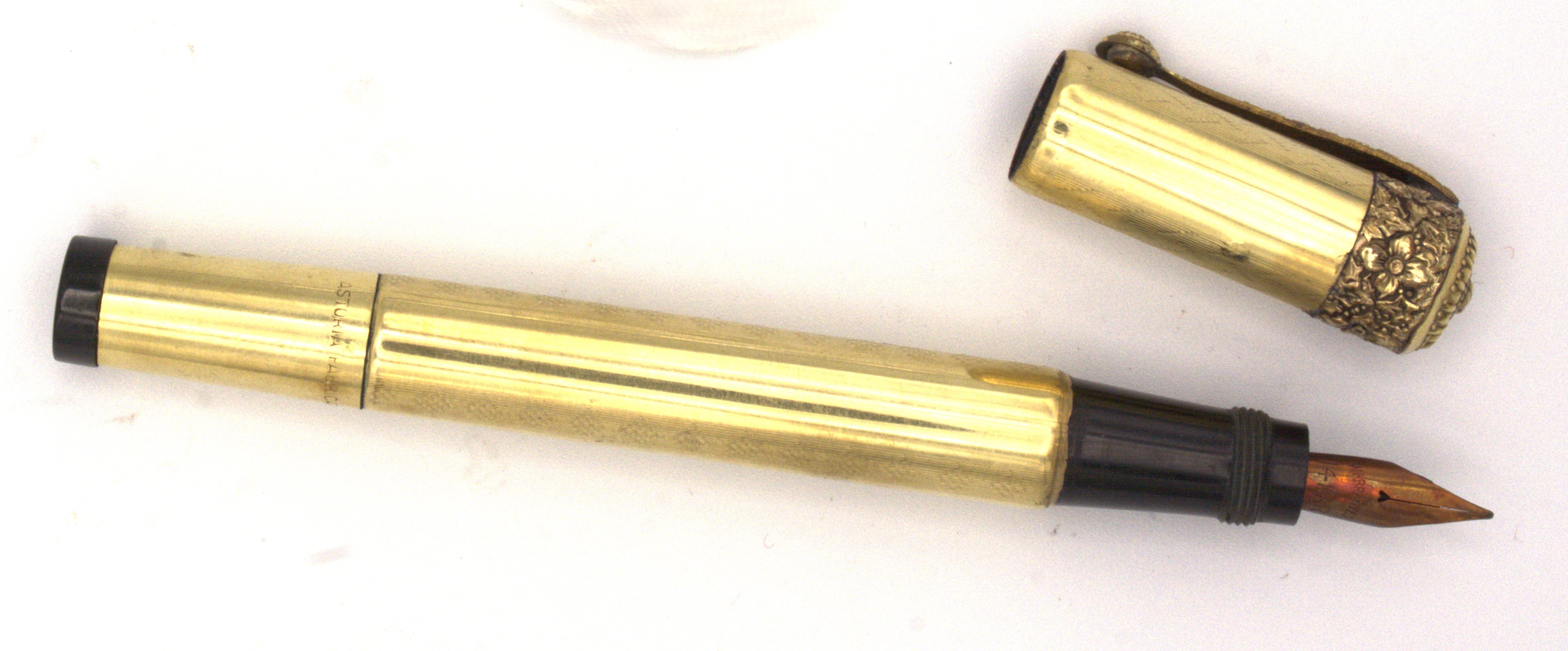 Fusto dorato e decorato con incisioni a motivi geometrici, cappuccio anch’esso dorato e decorato nella sommità con un motivo a fascia floreale.