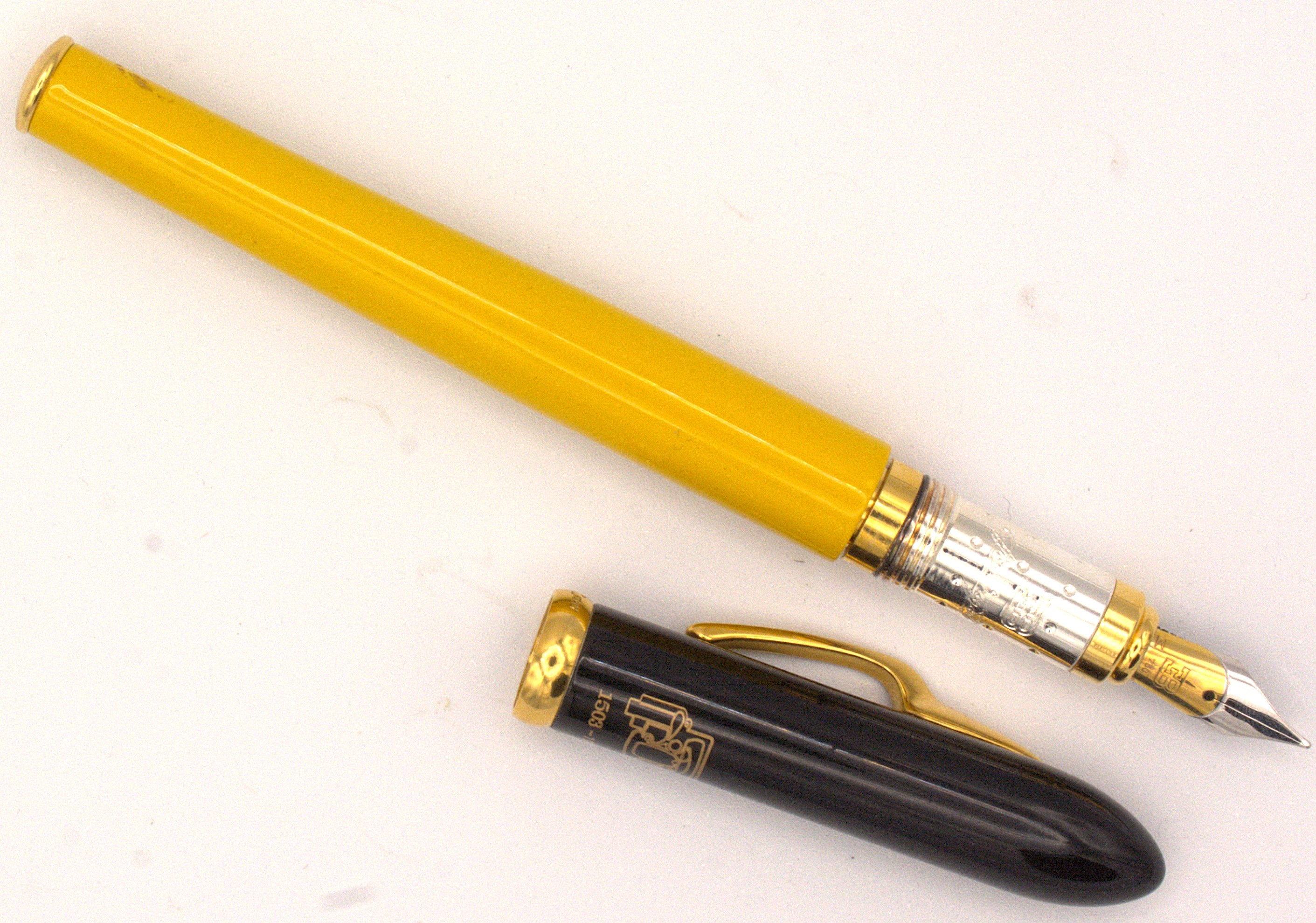 Fusto in resina di colore giallo, cappuccio in resina nera, dettagli di rifinitura in metallo dorato, impugnatura decorata con punzonature, logo e firma Ettore Bugatti, pennino in oro 18kt misura M, caricamento a stantuffo.