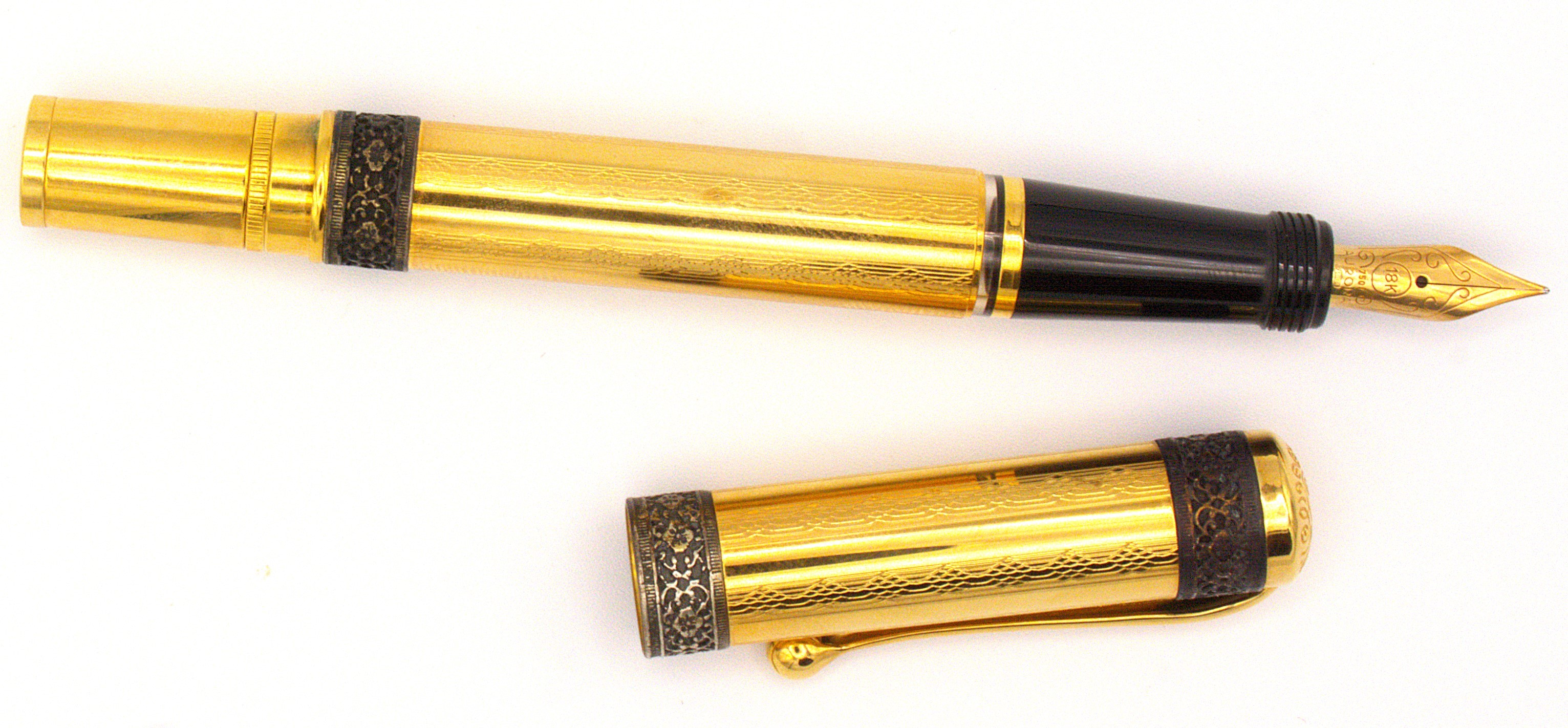 Fusto metallo dorato con particolari in argento 925, impugnatura in resina nera, pennino in oro 18 kt misura F, caricamento a stantuffo.