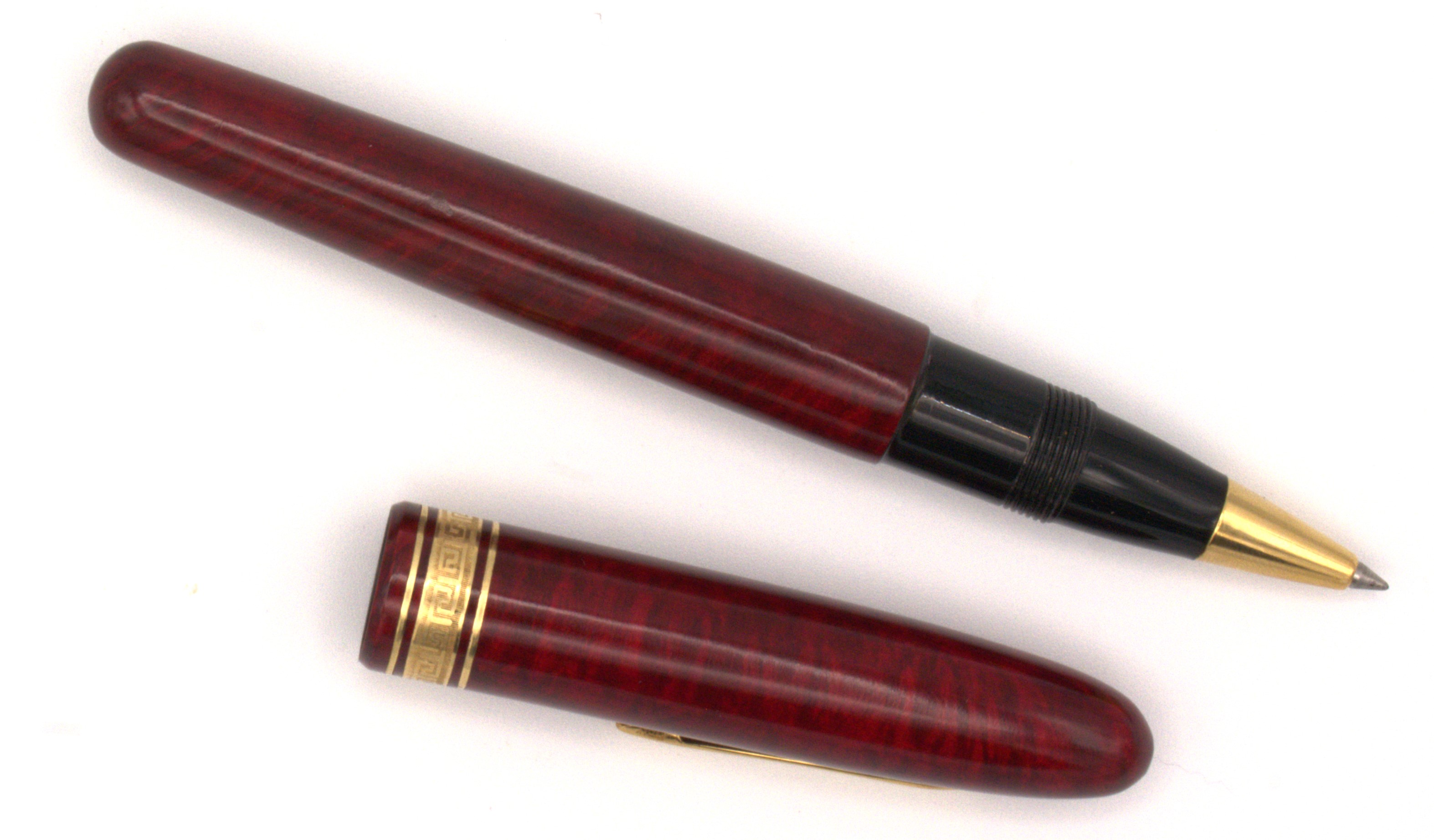 Fusto in radica rosso scuro, dettagli finitura in metallo dorato, decorazione con motivo a meandro, impugnatura in lacca nera, caricamento a stantuffo.