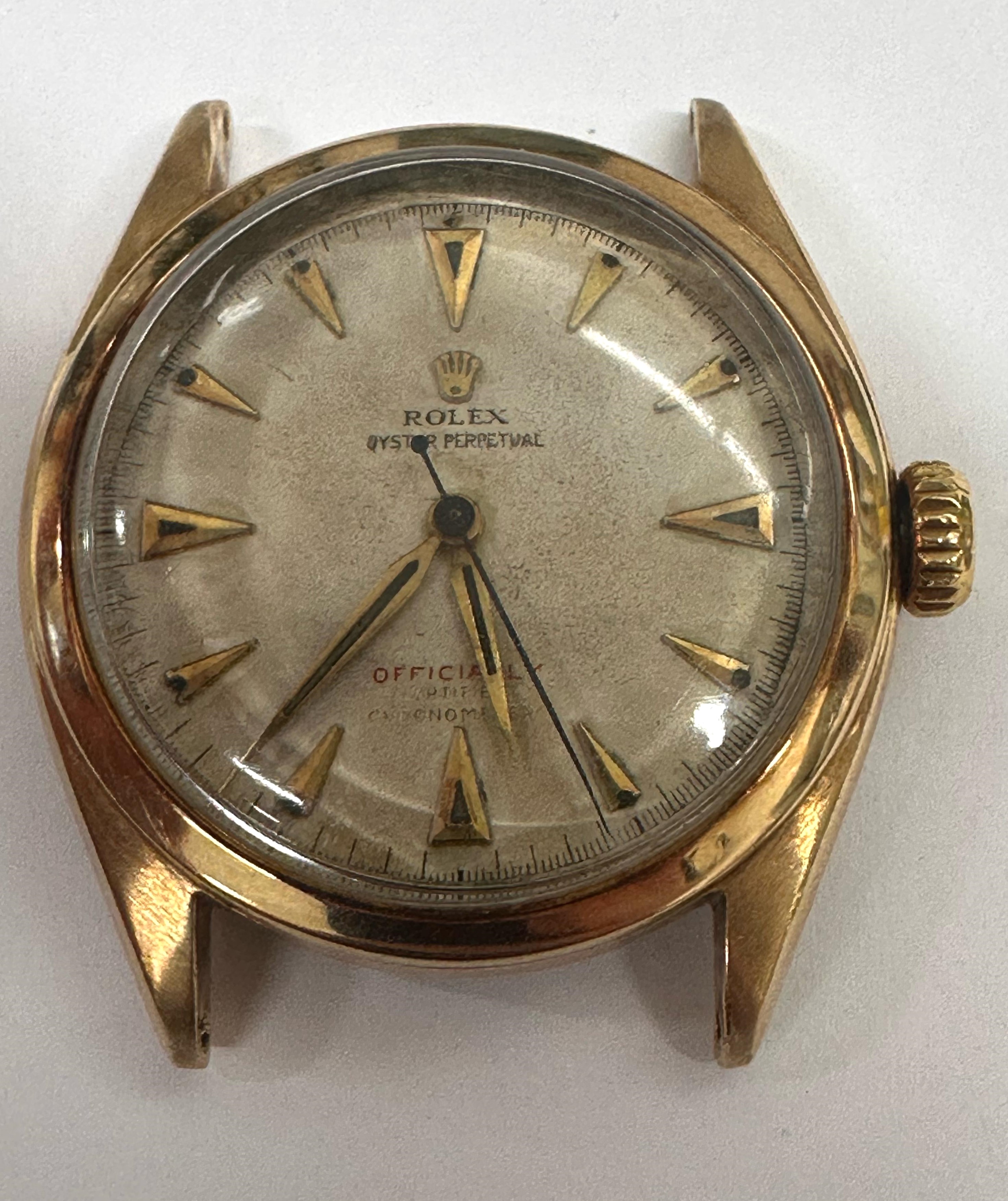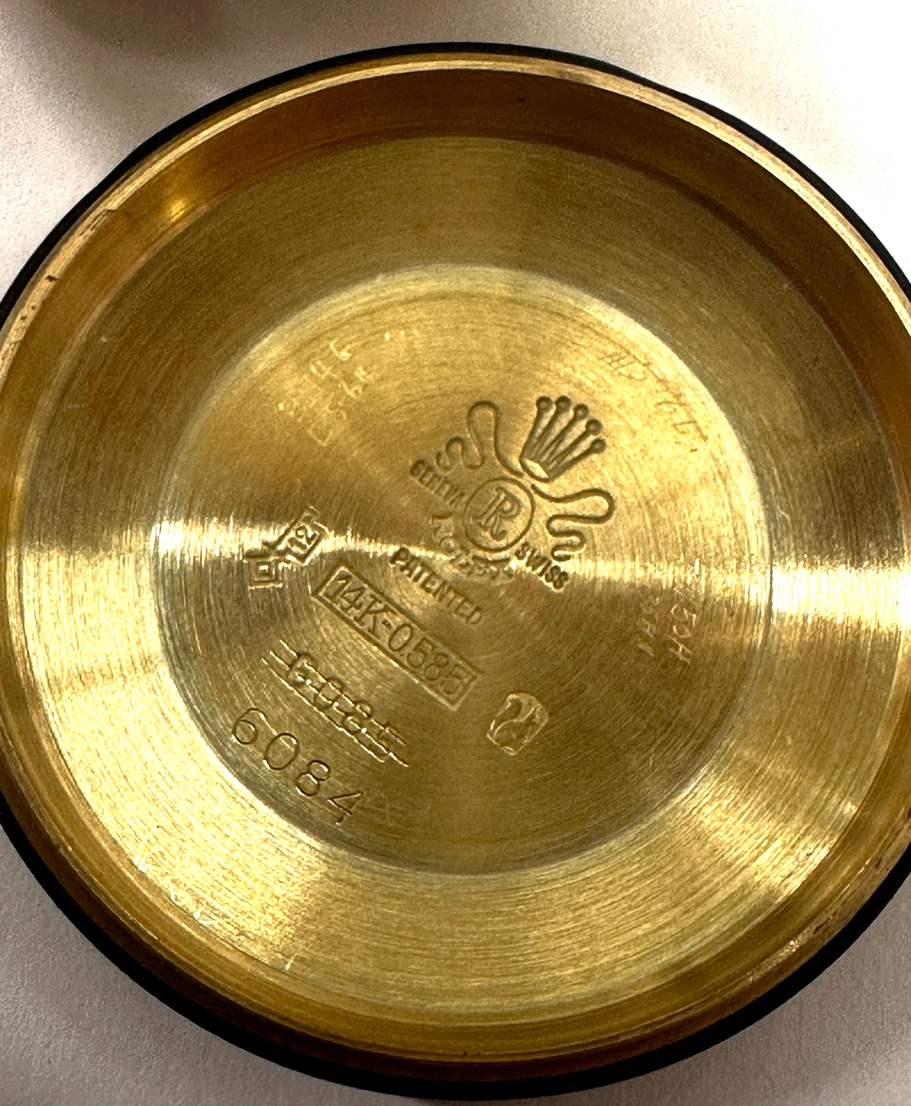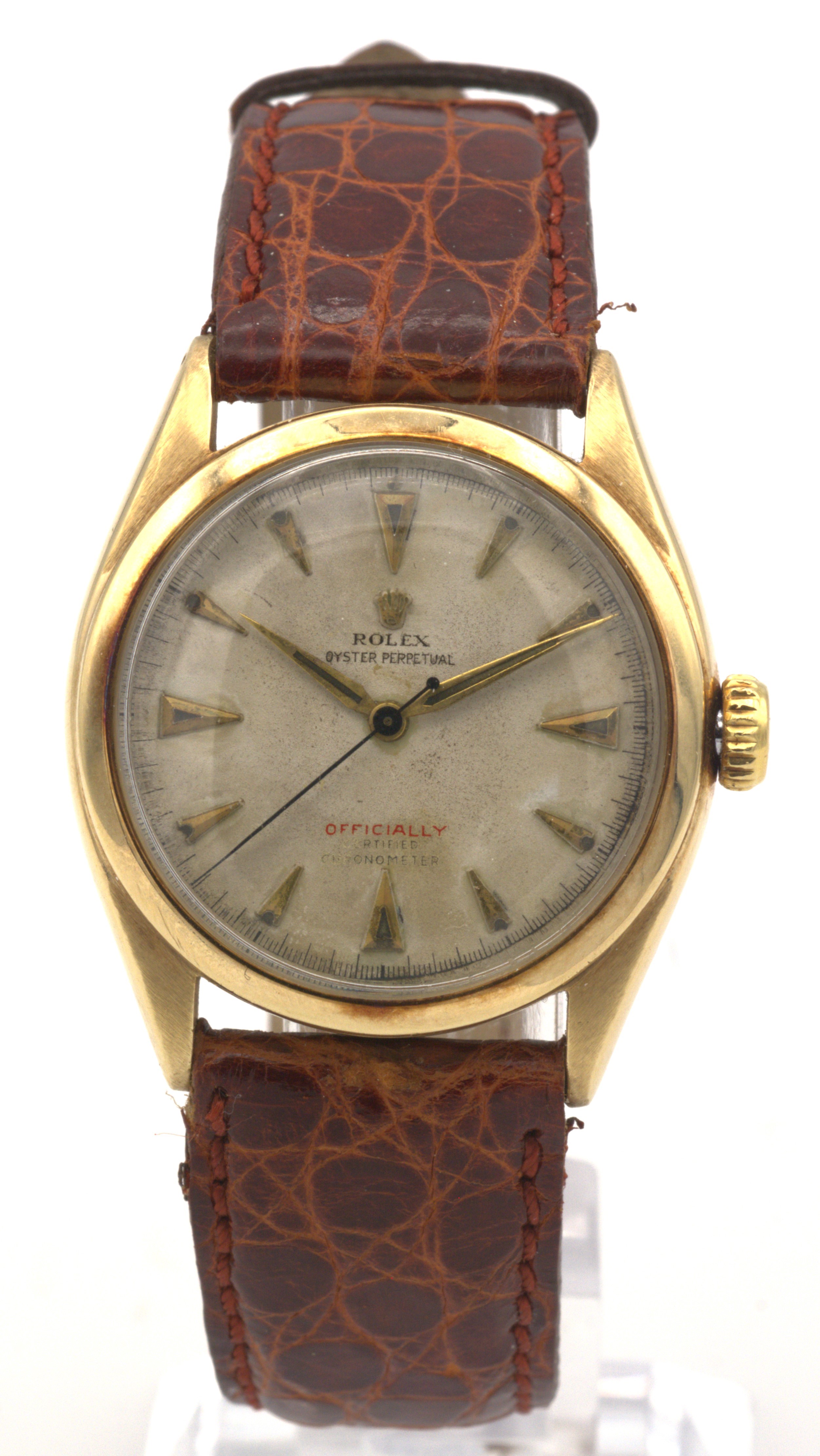 quadrante argento scritta rossa idici a punta di freccia, sfere Alfa, ref 6084 in Oro giallo 14 k matricola 63225 non chiara, Carica Automatica cal. 720 movimento n° H98526, Corona in oro Super + Oyster, Cassa a vite in due corpi ghiera in oro liscia, fondello a vite bombato con doppia referenza 6084 6805, Vetro plastica a cupola, Diametro della cassa 34 mm anno approssimativo 1955, accompagnato con cinturino in pelle con fibbia Ardiglione in oro Giallo 18 K originale Rolex, meccanica marciante non revisionata.