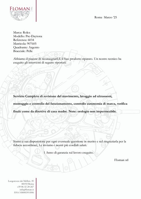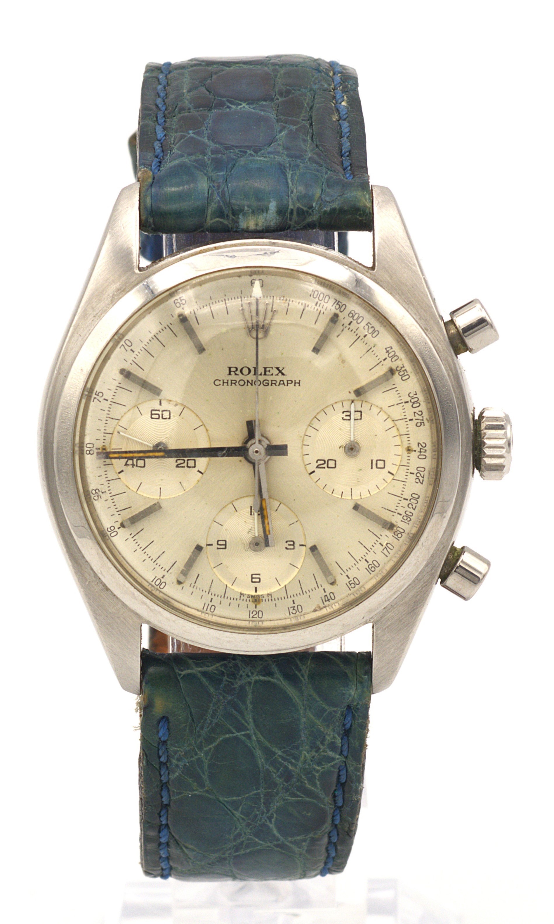 Rolex Chronograph Pré-Daytona ref 6034 matricola 907605 in acciaio Carica manuale Calibro V72, Pulsanti a poma camice dei pulsanti ossidate dal tempo, Corona a vite, Cassa a vite in due corpi ghiera in acciaio liscia, Vetro plastica a cupola, Diametro della cassa 36 mm anno 1962 accompagnato con cinturino blu con fibbia Ardiglione, Quadrante x referenza 6238 in buono stato di conservazione meccanica revisionata e perfettamente funzionante garantito 1 anno dalla data di aggiudicazione.