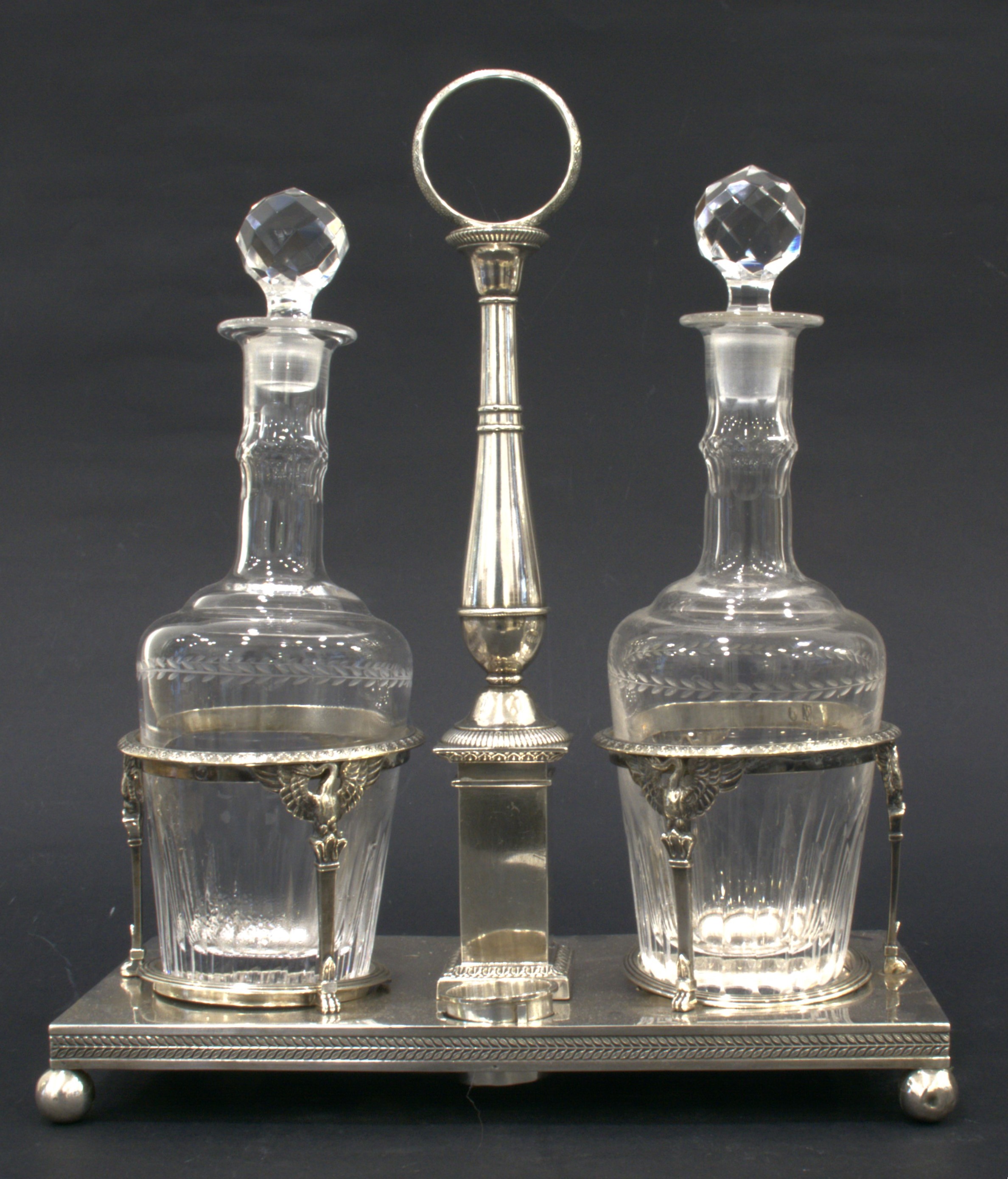 Oliera eseguita a Parigi. Punzone dell’ Association des Orfevres. Punzone di cui alla legge 19 Brumaio anno VI. Punzone di garanzia Parigi. Punzone del fabbricante.Aquile sulle fasce di sostegno delle oliere. Peso dell’argento gr. 726