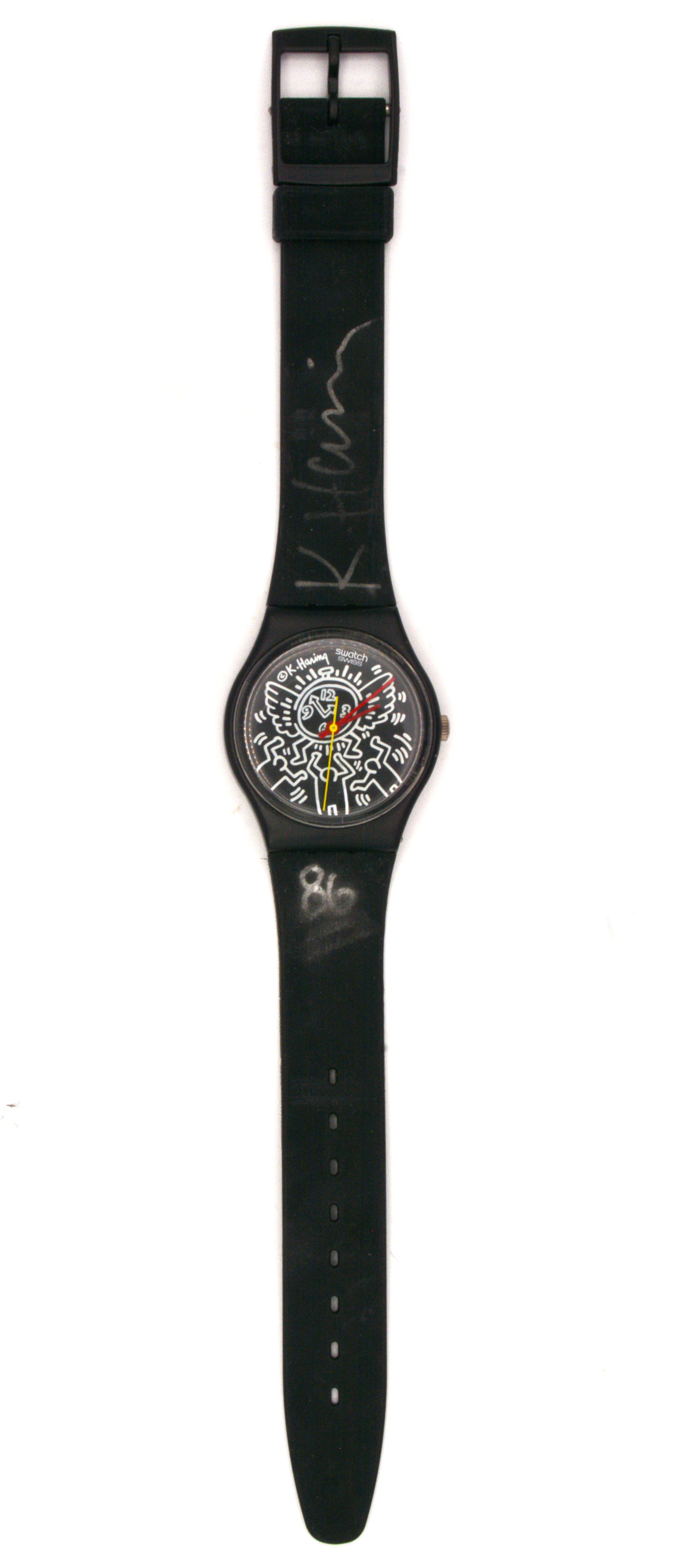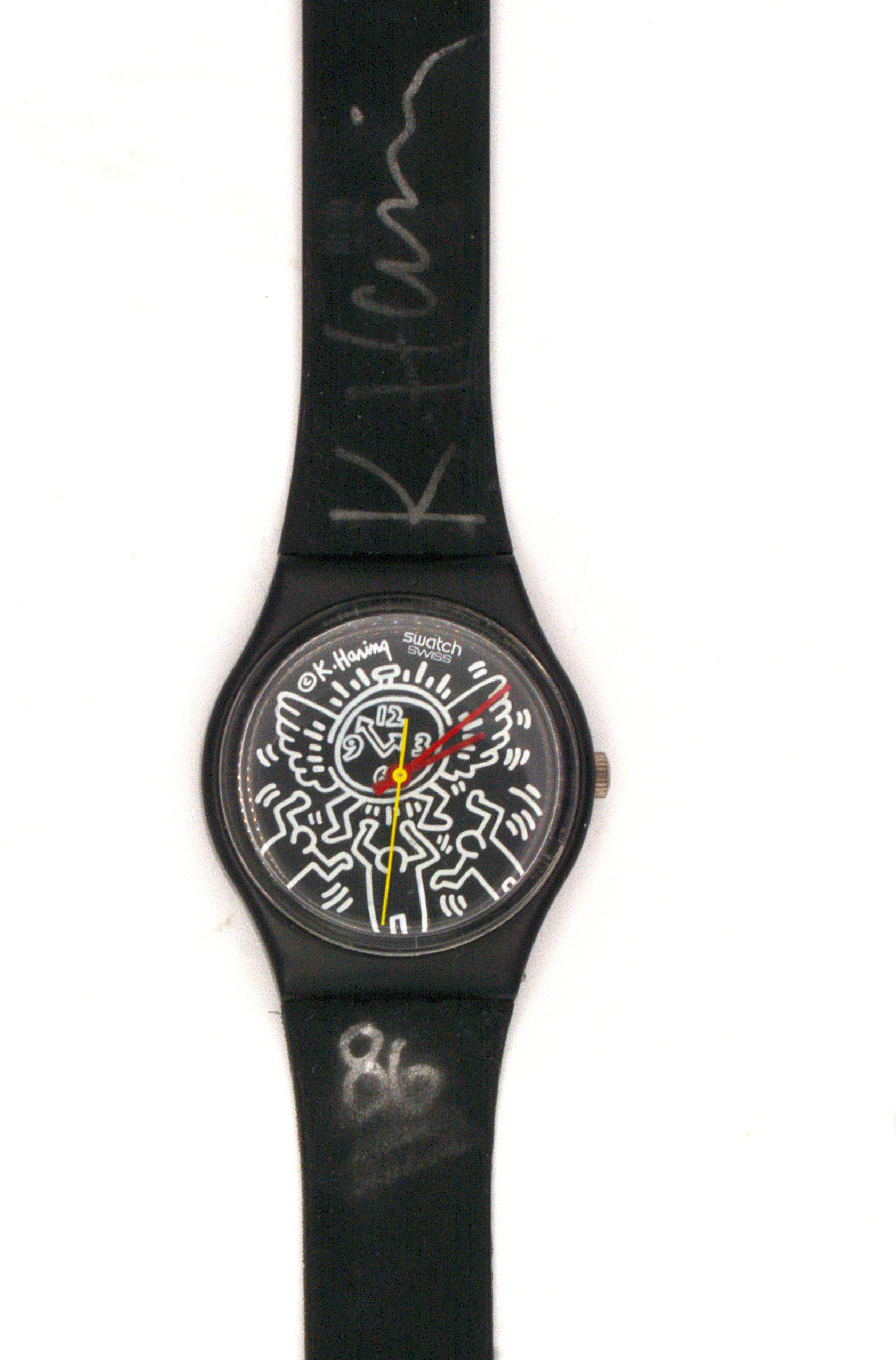 Orologio da polso in tecnica mista Swatch Special 1986 – GZ104 – Blanc Sur Noir disegnato da Keith Haring. Edizione limitata e numerata nr. 7549, visibile sul retro del quadrante.