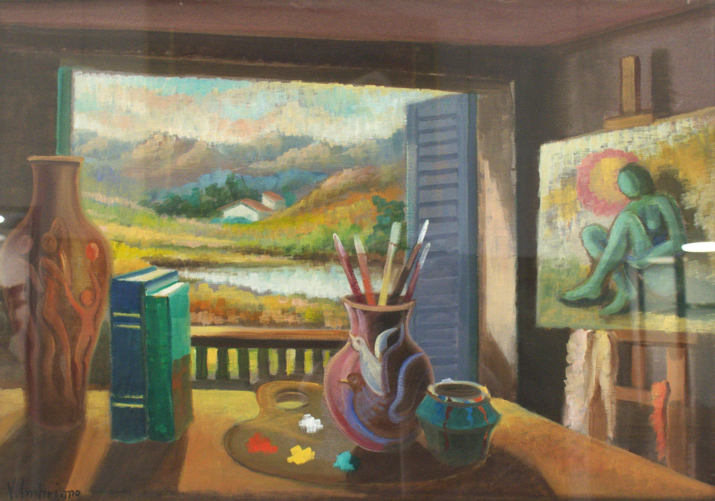 VINCENZO IMBRIANO ( SANT ANGELO DEI LOMBARDI 1921 ), Paesaggio da un' interno ( 1980 ).