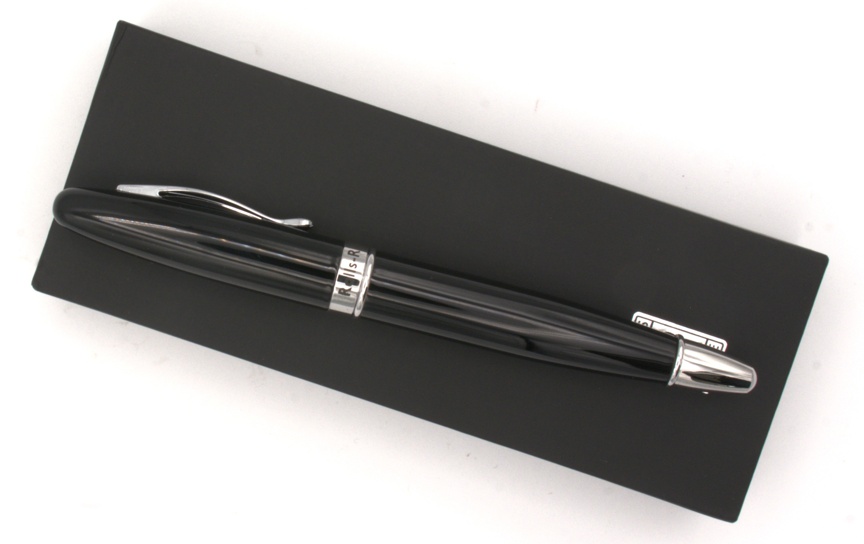 Fusto e cappuccio nero lucidi, rifiniture argentate e logo RR sul fermaglio.
