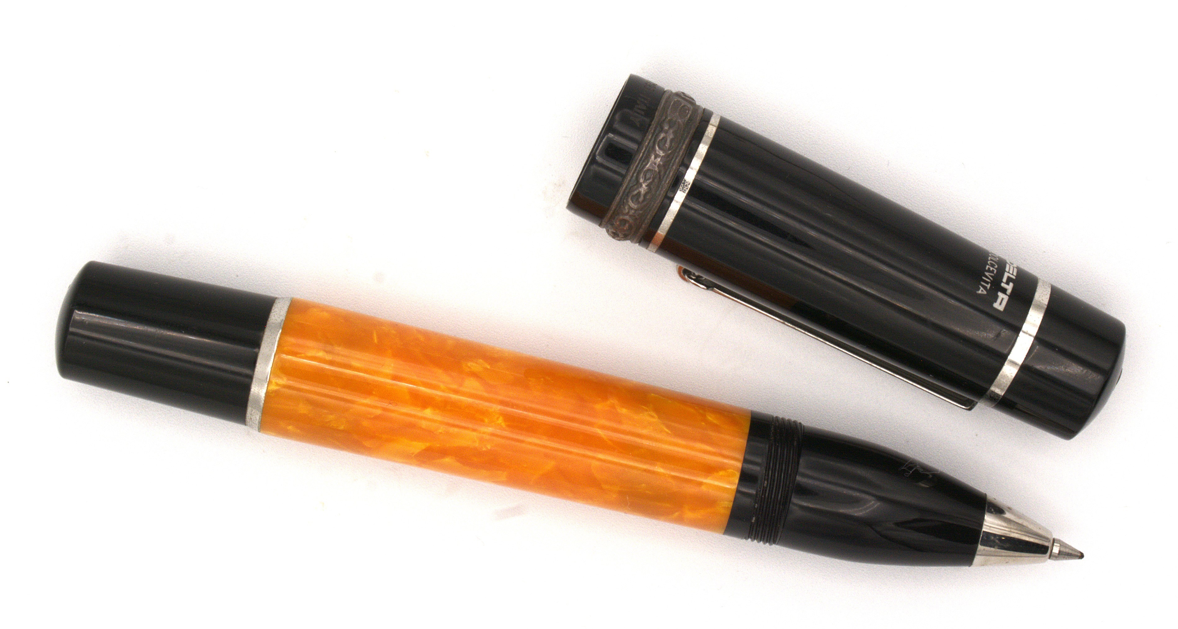 Fusto in resina arancione, fondello e cappuccio neri con rifiniture argentate.