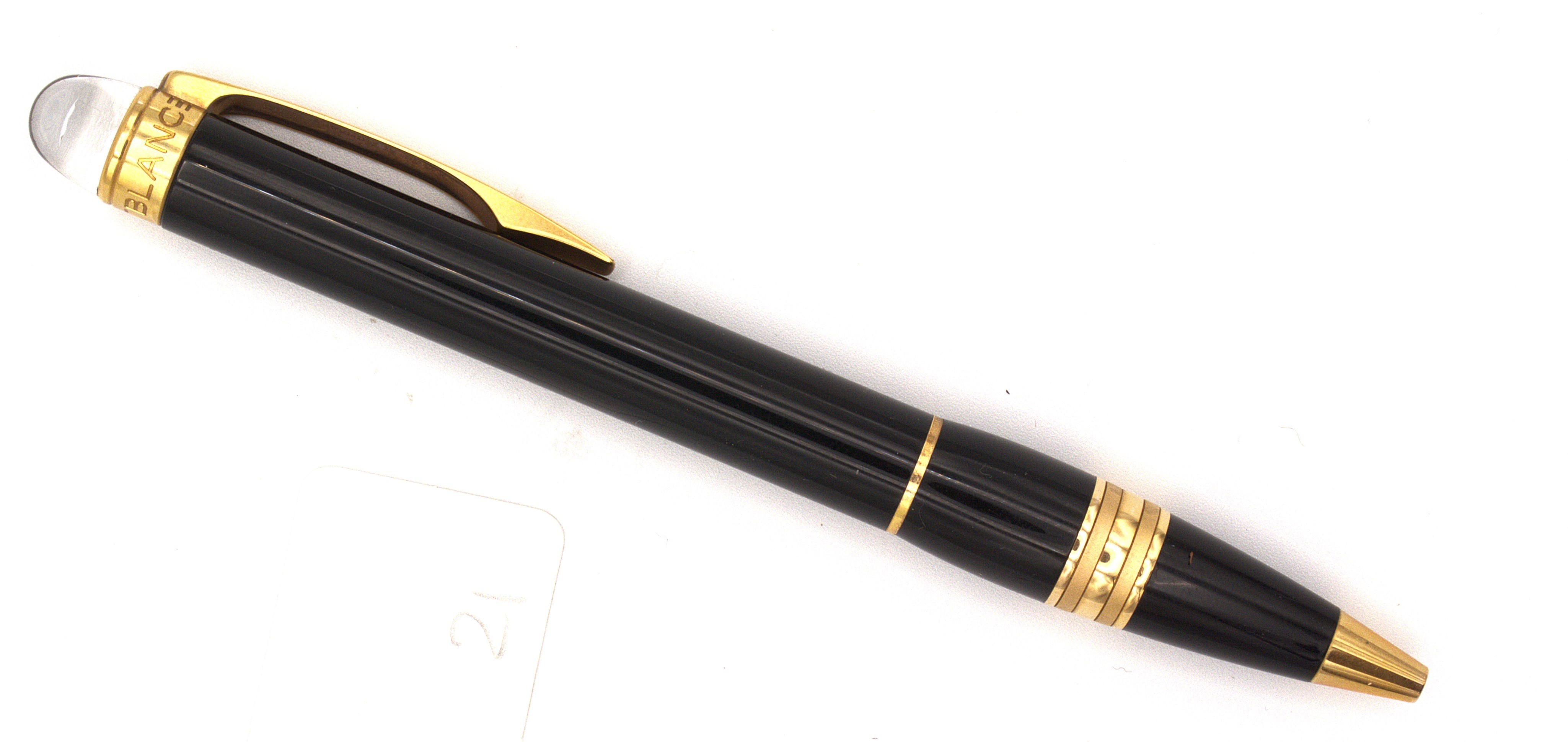 Corpo in resina nera lucida con rifiniture dorate. Stella Montblanc fluttuante inserita in una cupola in resina trasparente.