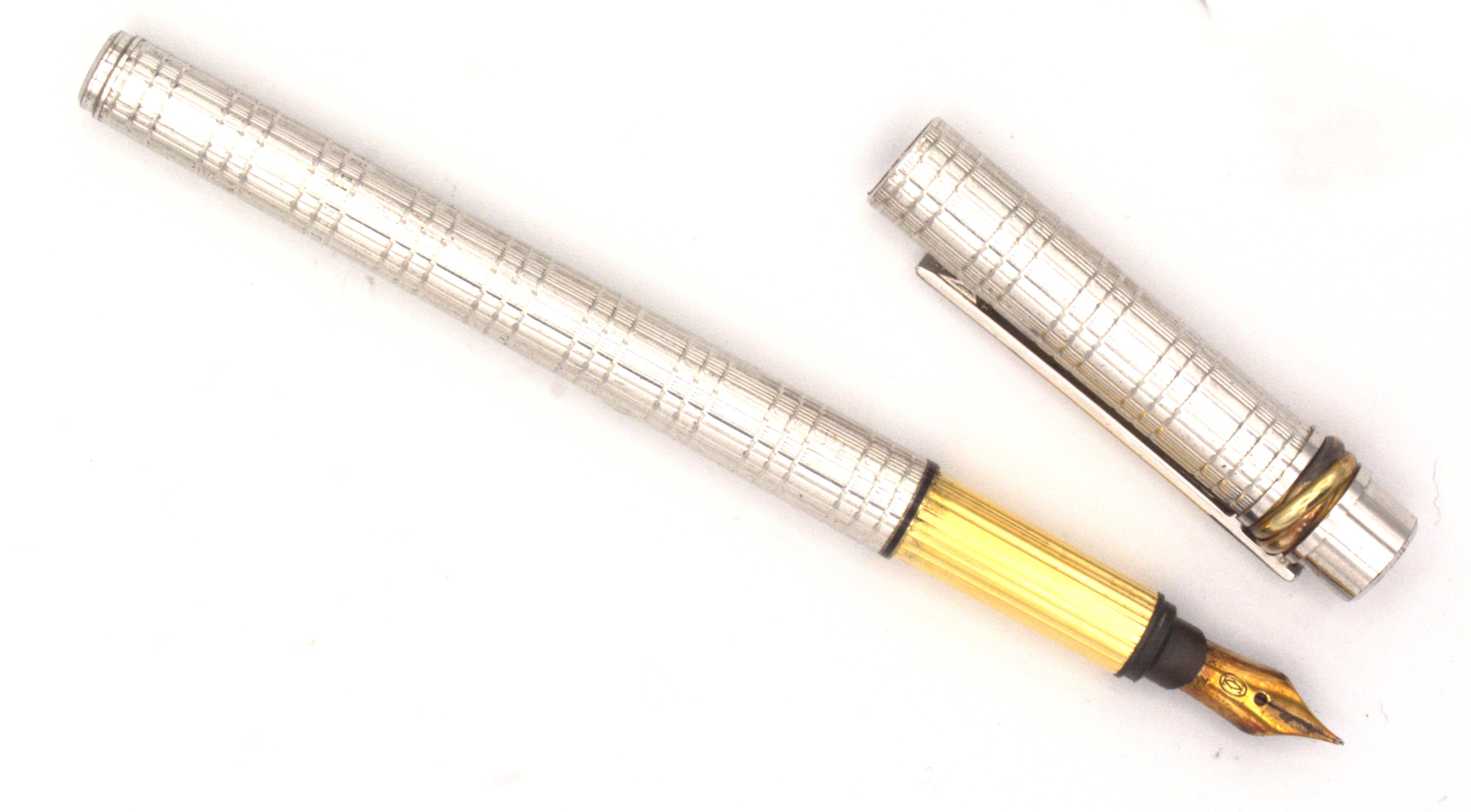 Fusto con una decorazione a quadrettatura e logo sulla sommità del cappuccio. Pennino in oro 18k.