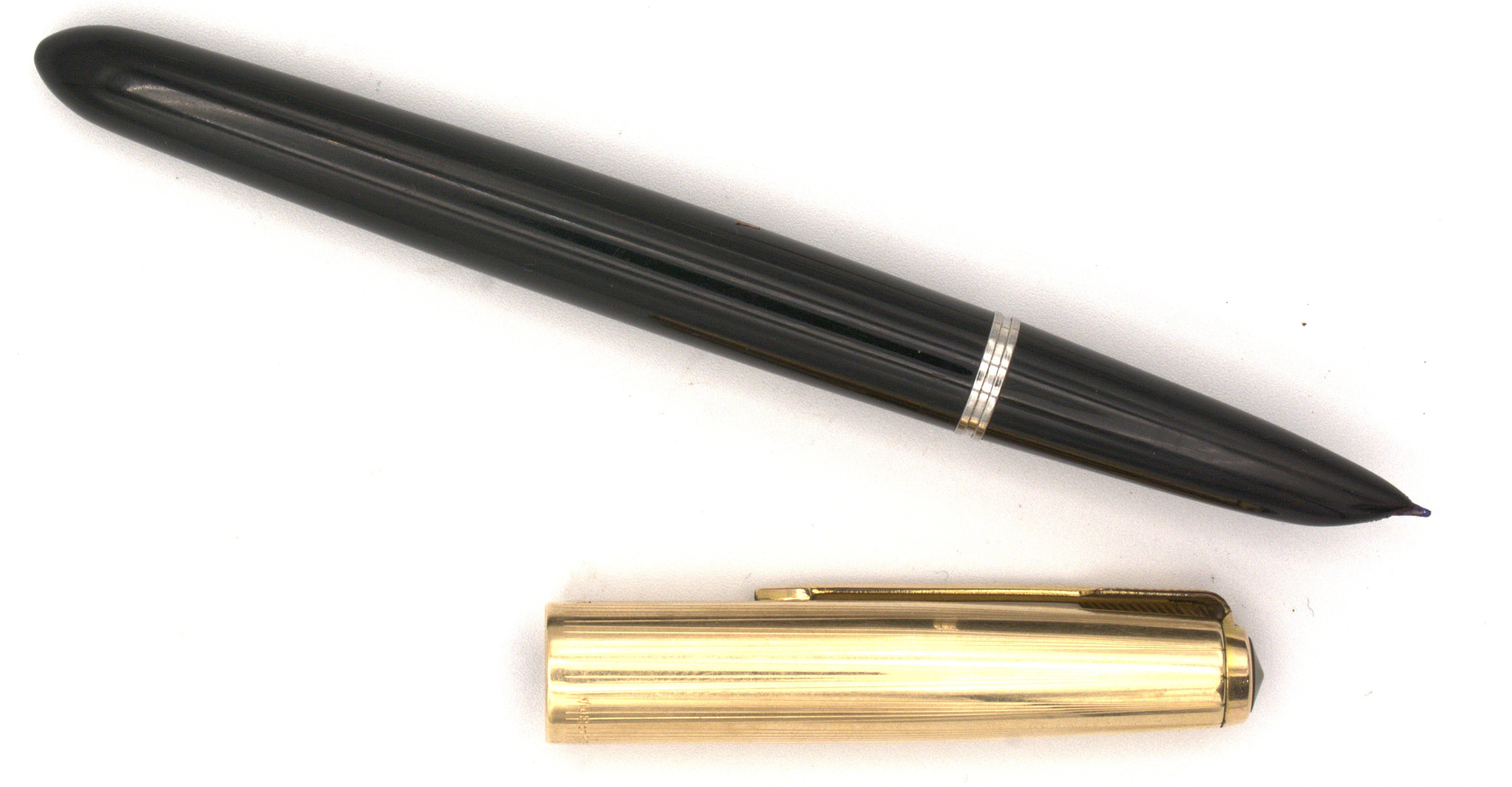 Fusto in resina nero, cappuccio scanalato in metallo dorato con fermaglio a forma di freccia.