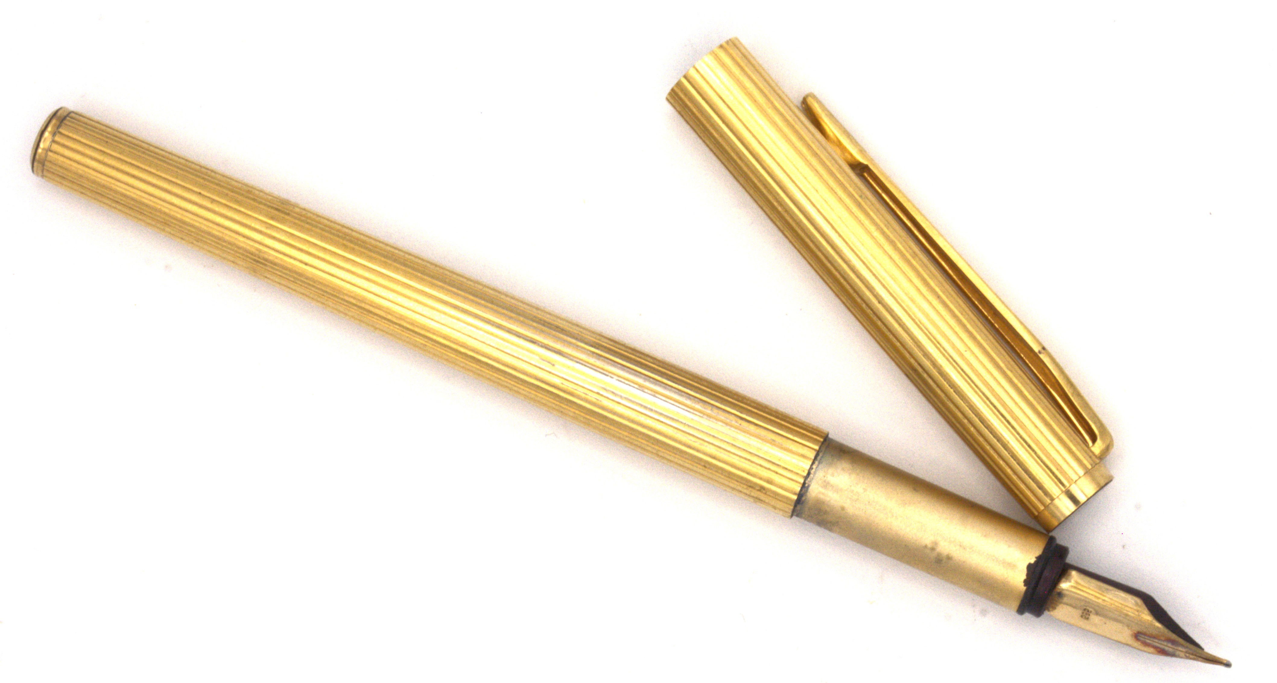 Penna in oro 14k, anni ’70, corpo laminato con scanalature verticali in oro. Pennino in oro a basso titolo, decoro con stella bianca Montblanc intarsiata.