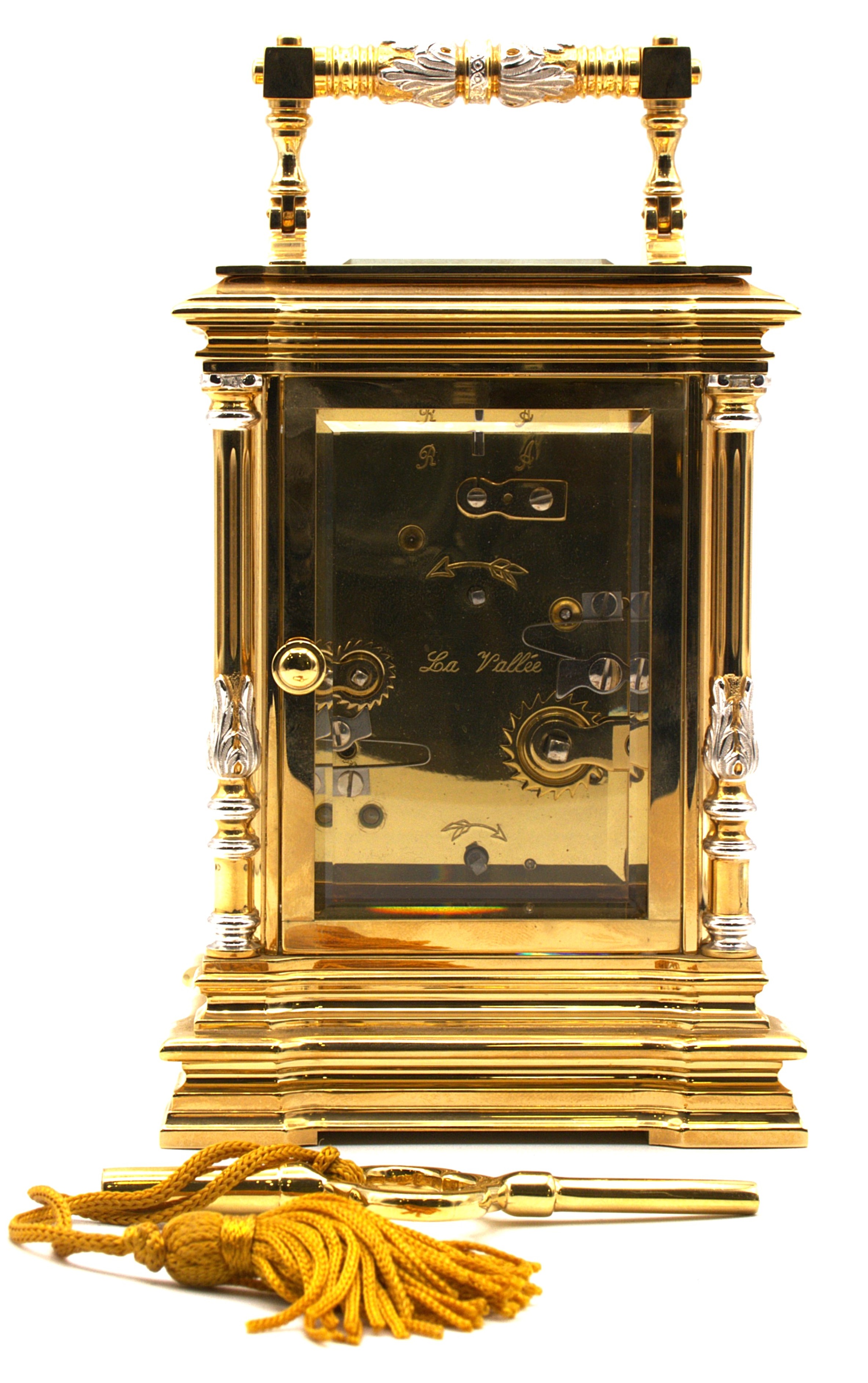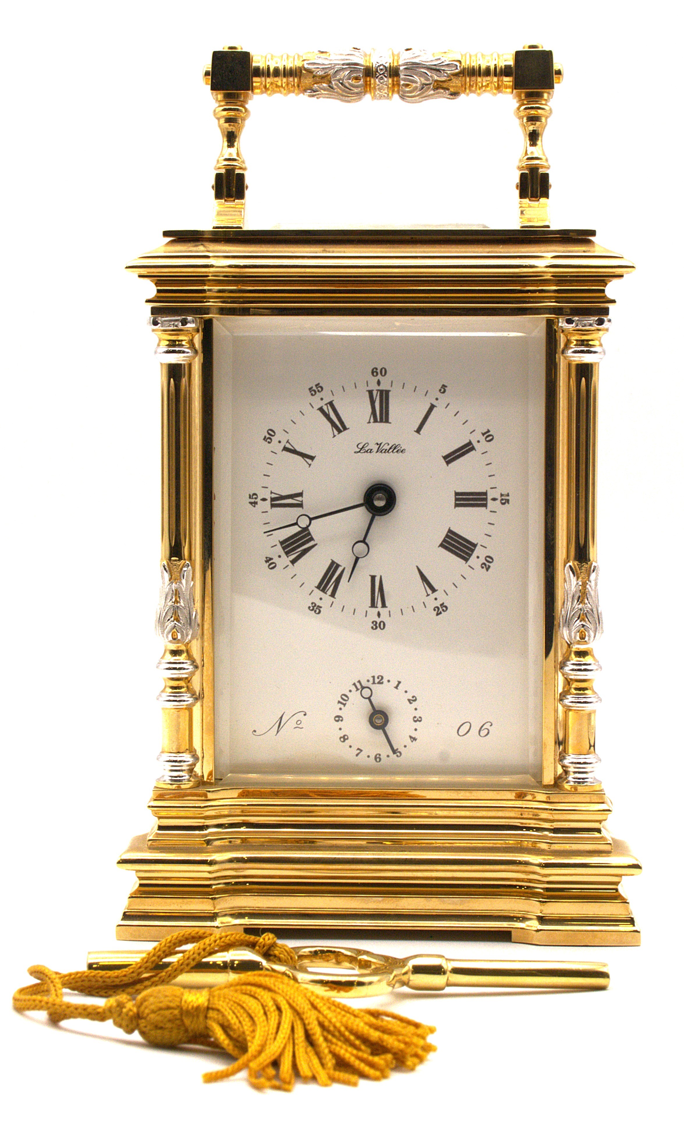 Orologio da officier, numero 6 della serie, con cassa dorata. Il manico superiore, le colonne scanalate ai lati e i capitelli sono arricchiti da inserti di colore argento. Il quadrante bianco presenta numeri romani e lancette Breguet. L’orologio è marciante e dotato di chiave.