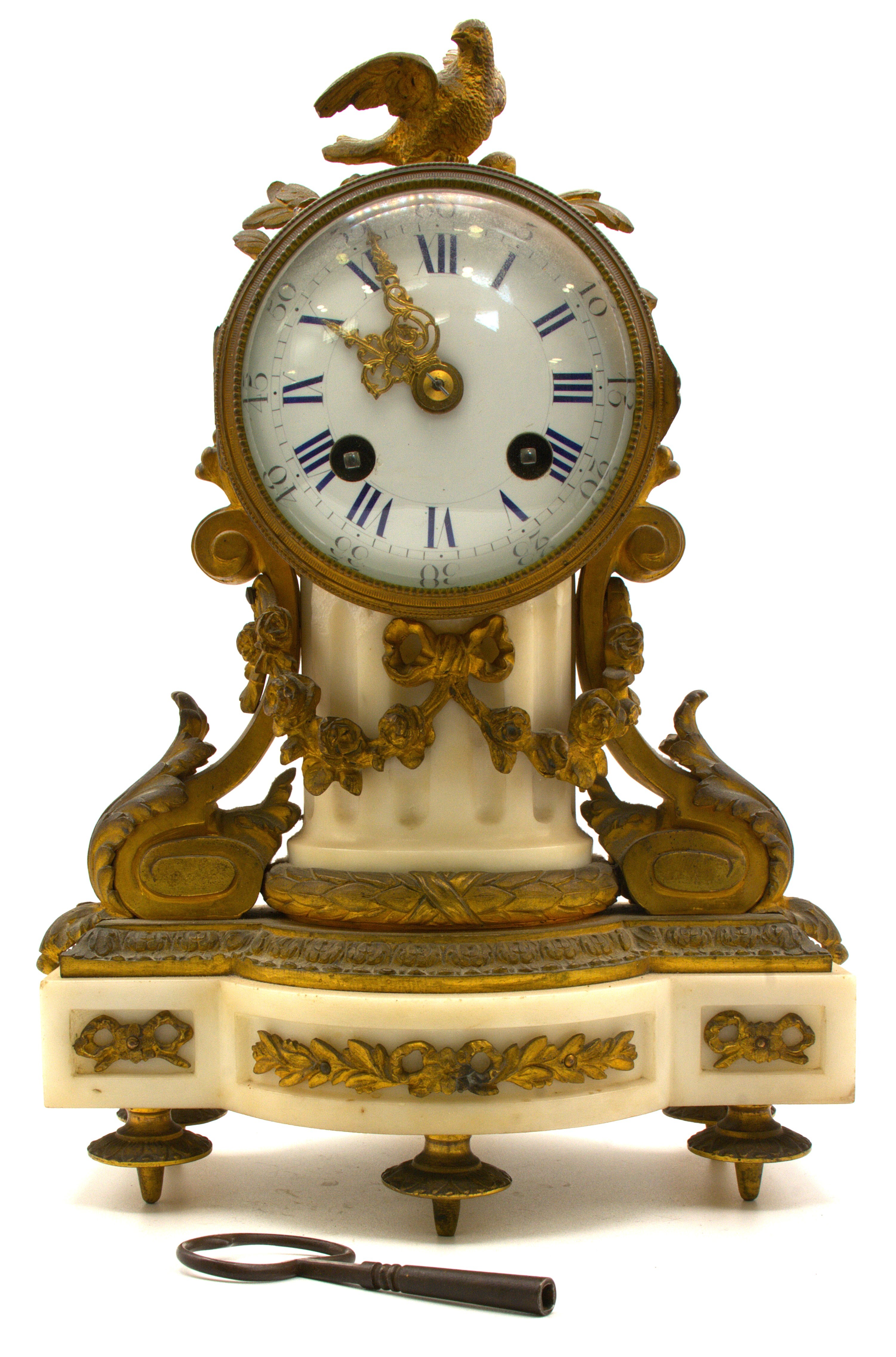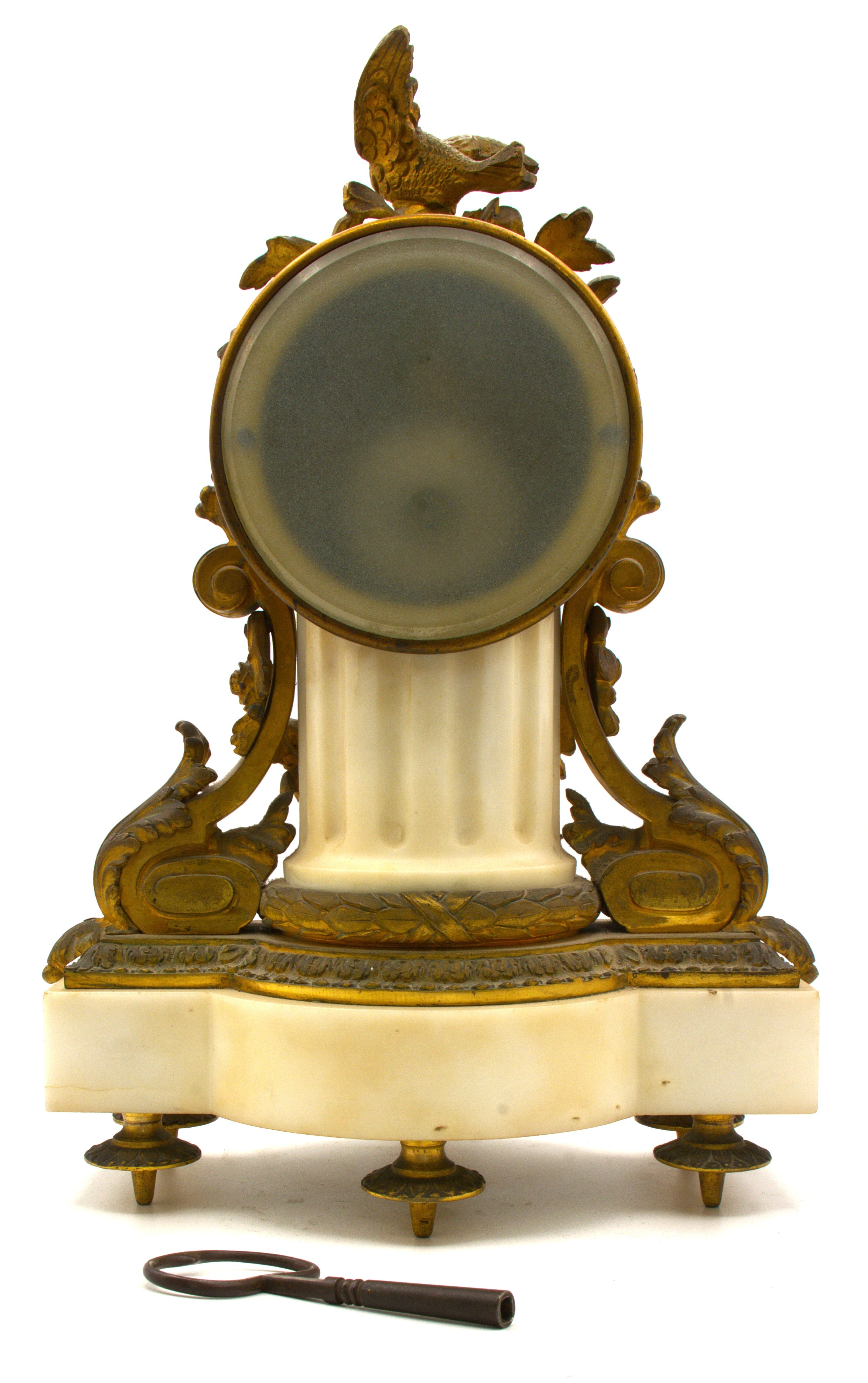 Orologio in bronzo dorato con quadrante in smalto bianco e numeri romani. Dotato di chiave per la ricarica.
