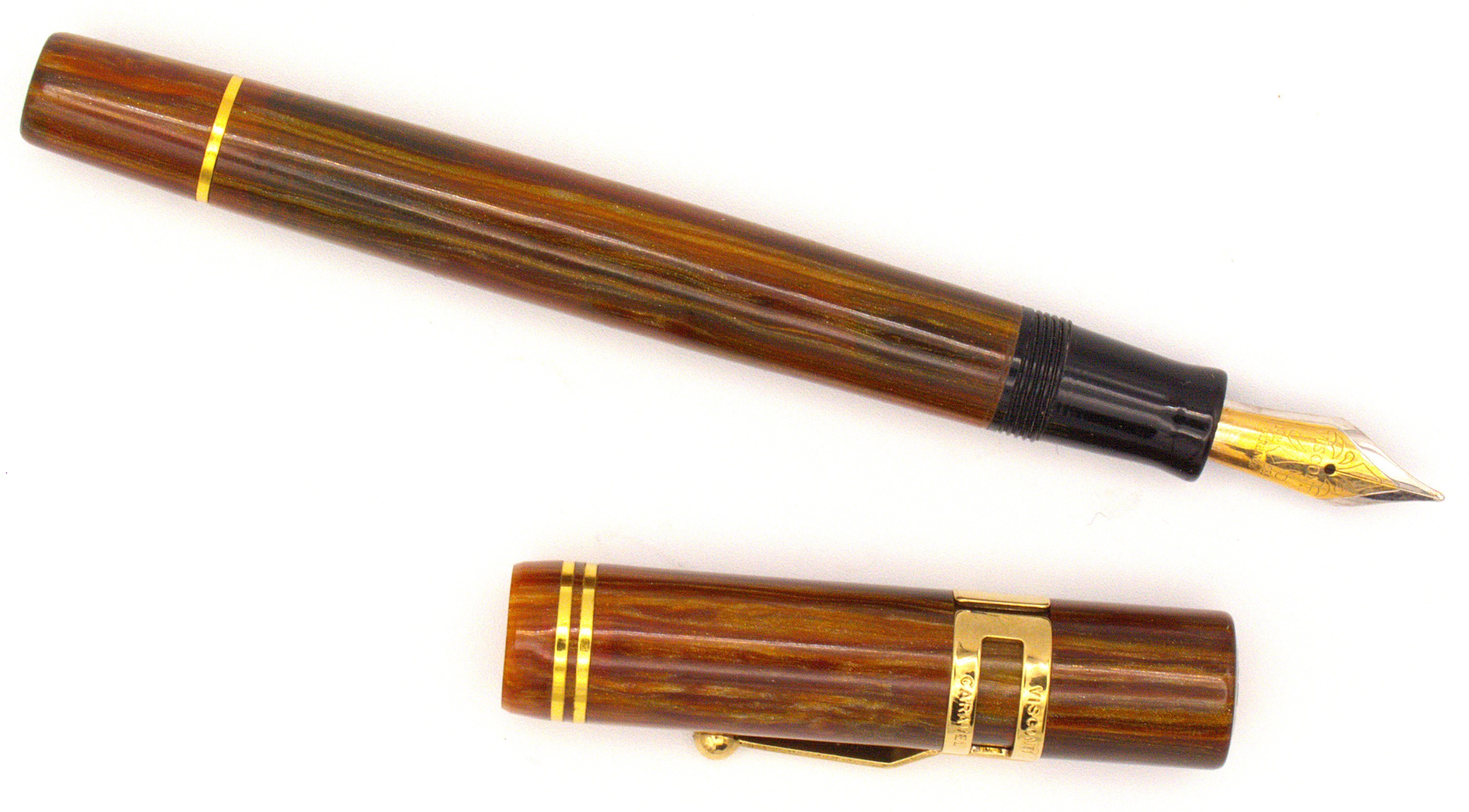 Fusto in resina marrone effetto legno, dettagli finiture in metallo dorato, pennino in oro 14kt, caricamento a stantuffo.