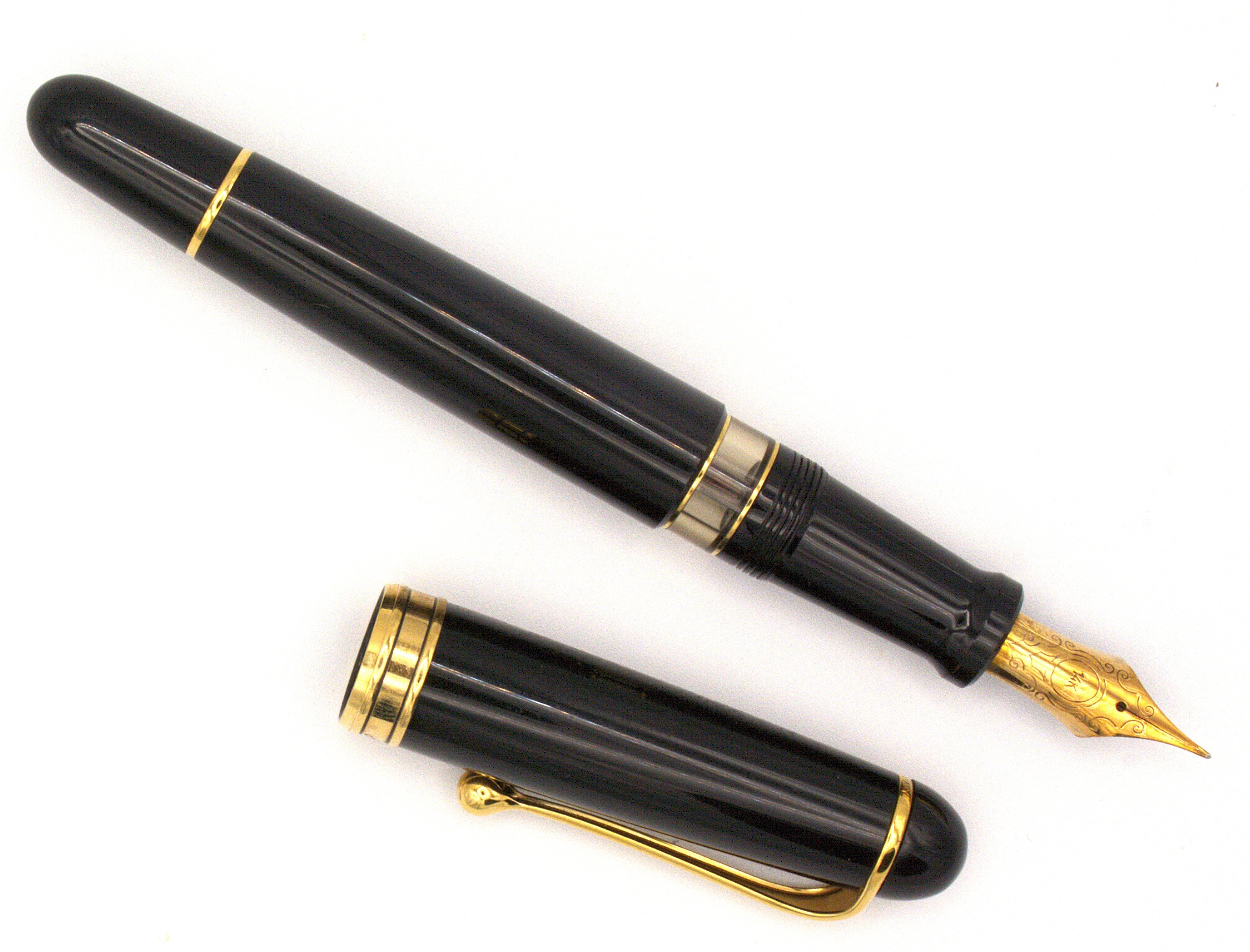 Fusto in resina nera con finiture dorate, pennino in oro 14 kt misura F, caricamento a stantuffo.