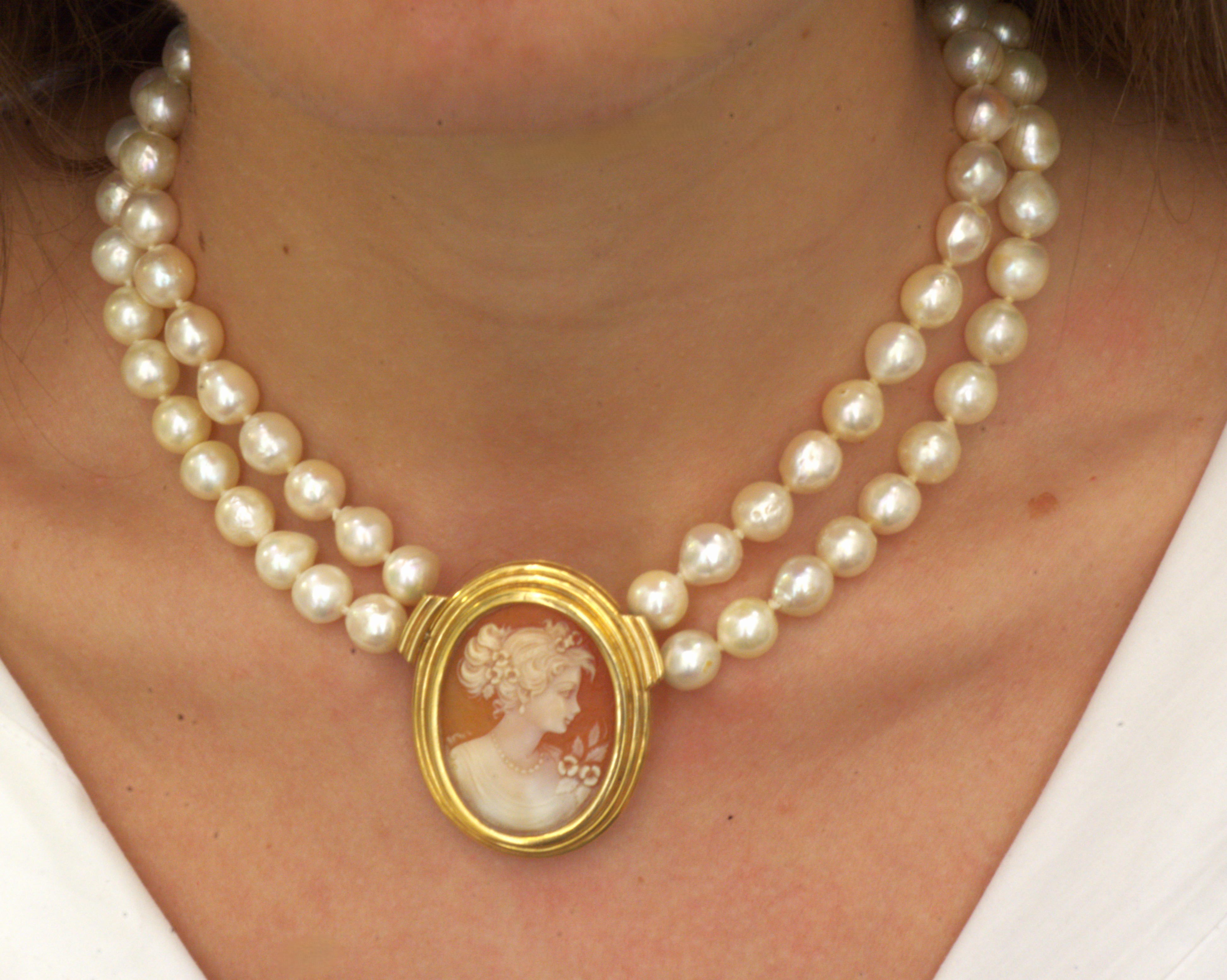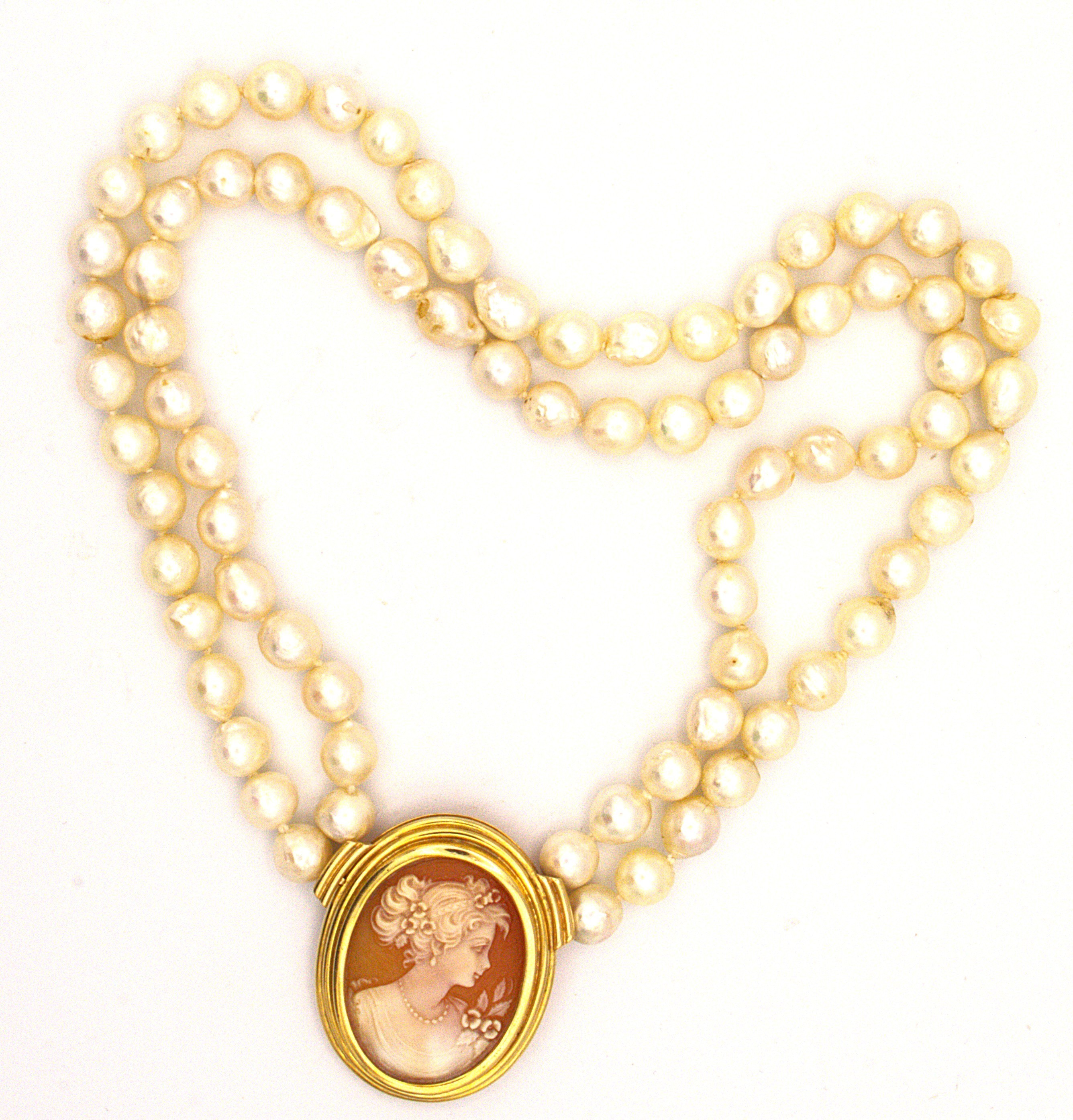 Due fili di perle scaramazze. chiusura in oro 18 kt e cammeo
