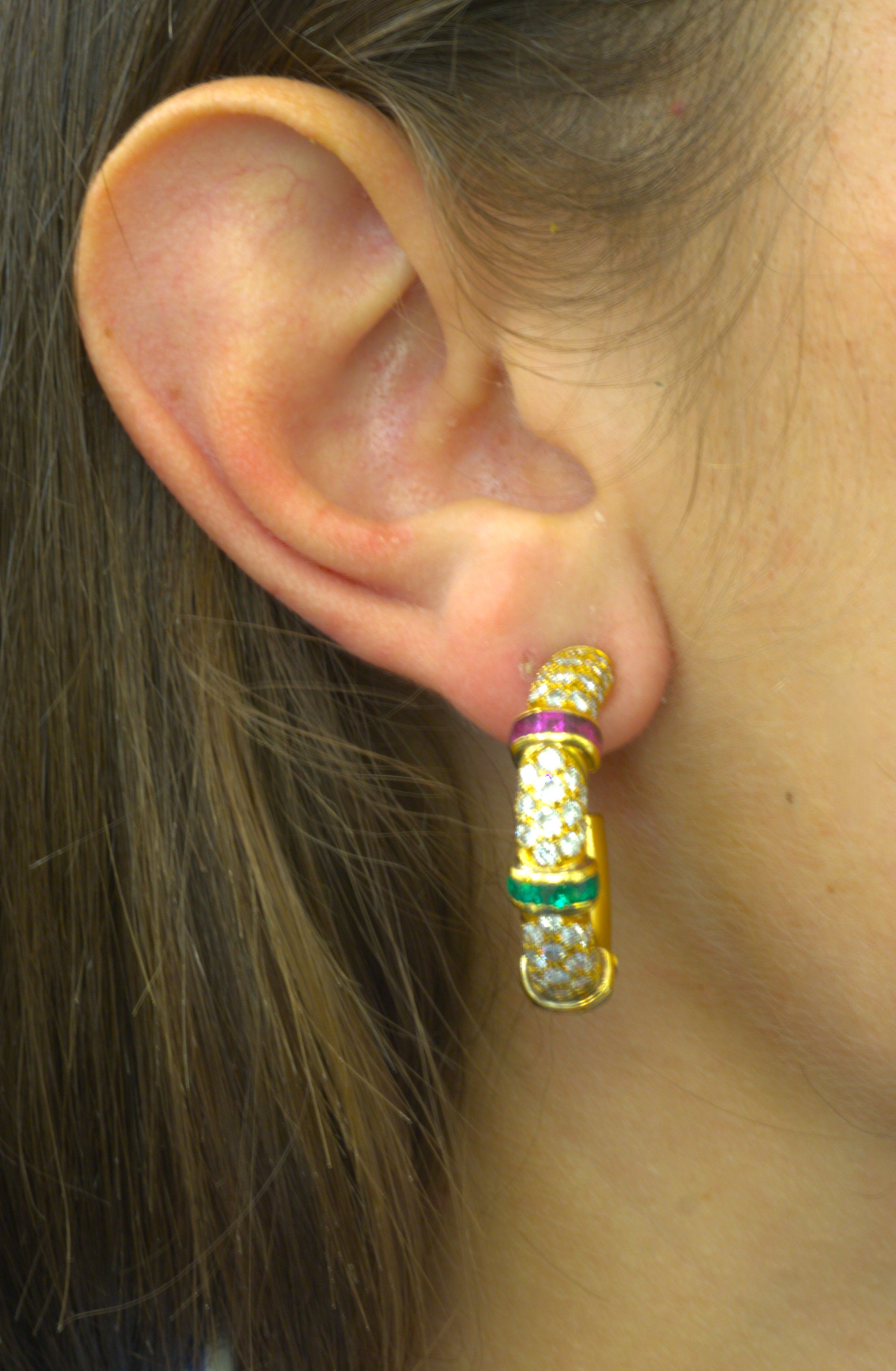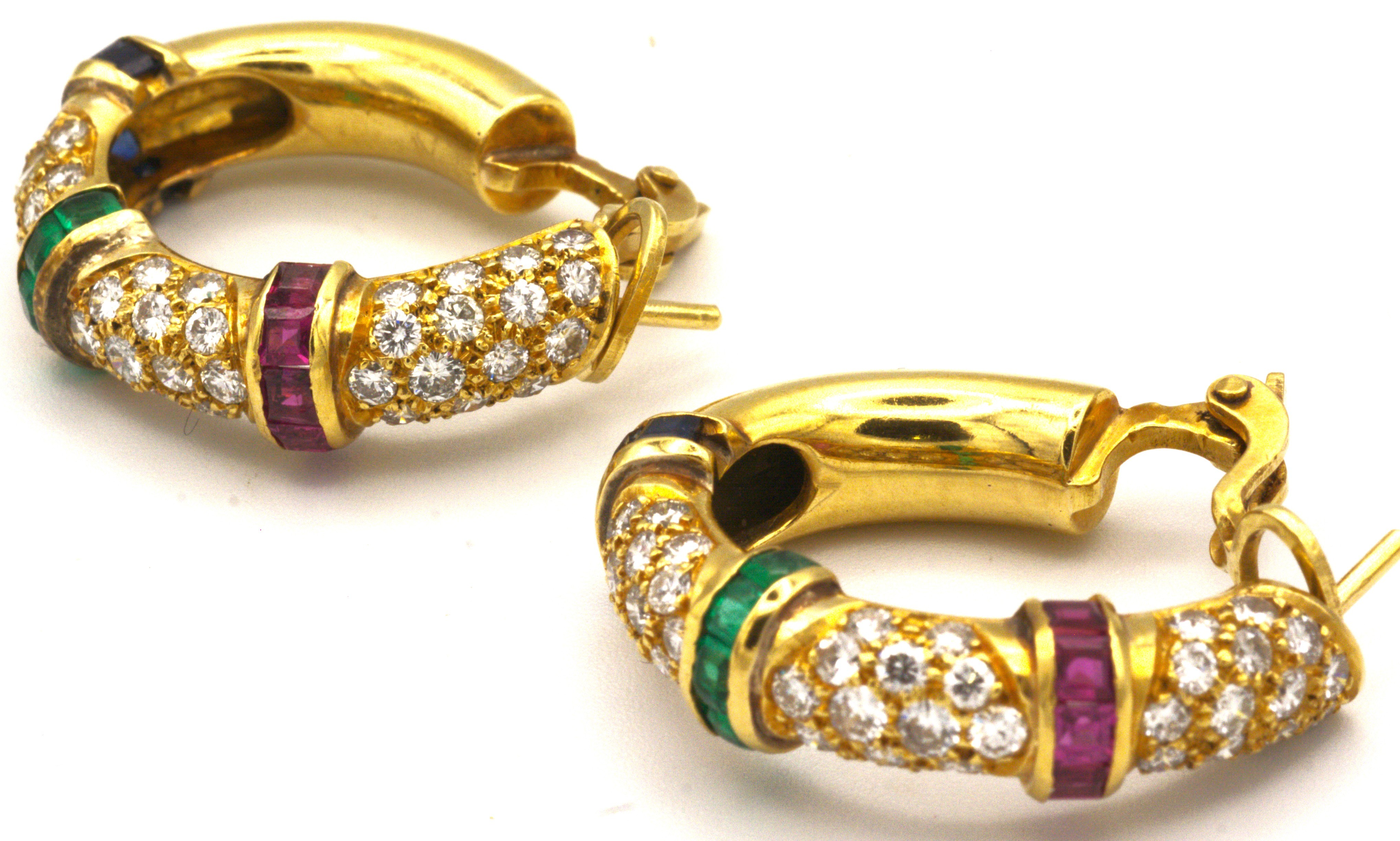 Orecchini a cerchio brillanti, ubini, zaffiri e smeraldi. Oro giallo 18 Kti