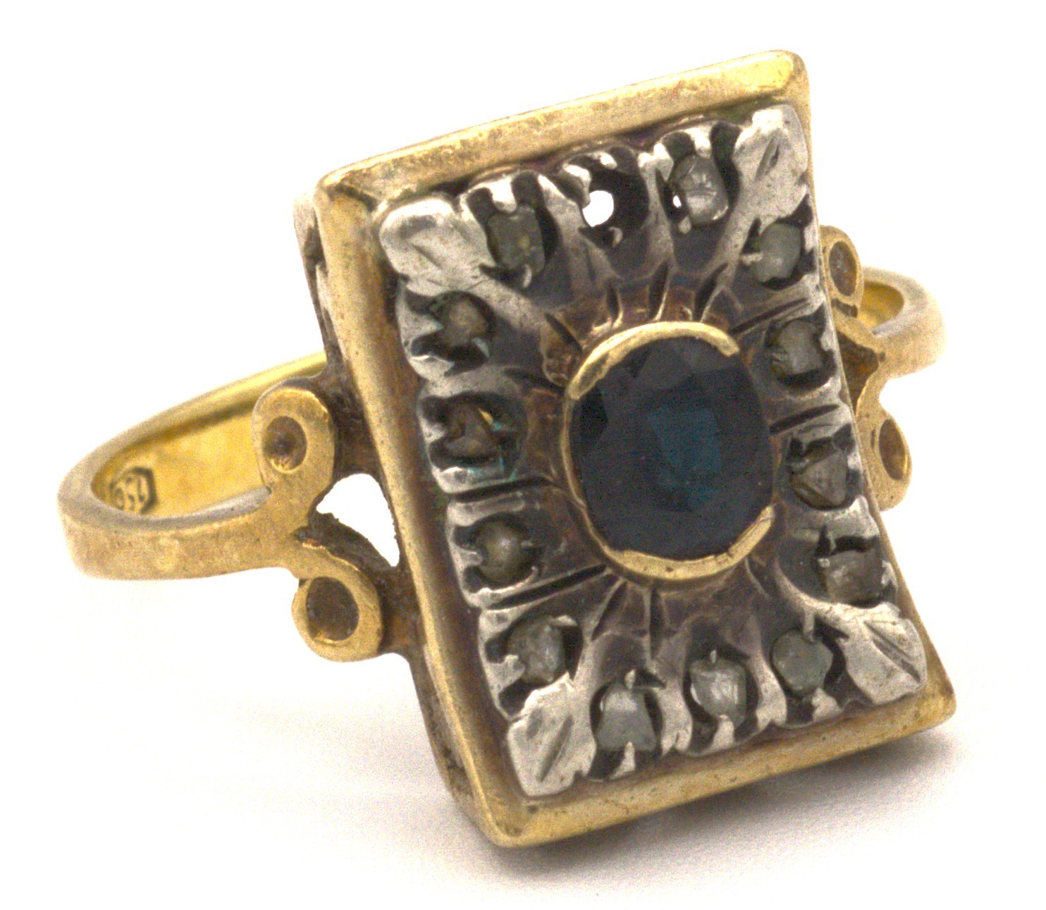 Anello rettangolare concavo in oro e argento, pietra blu e schegge di diamante
