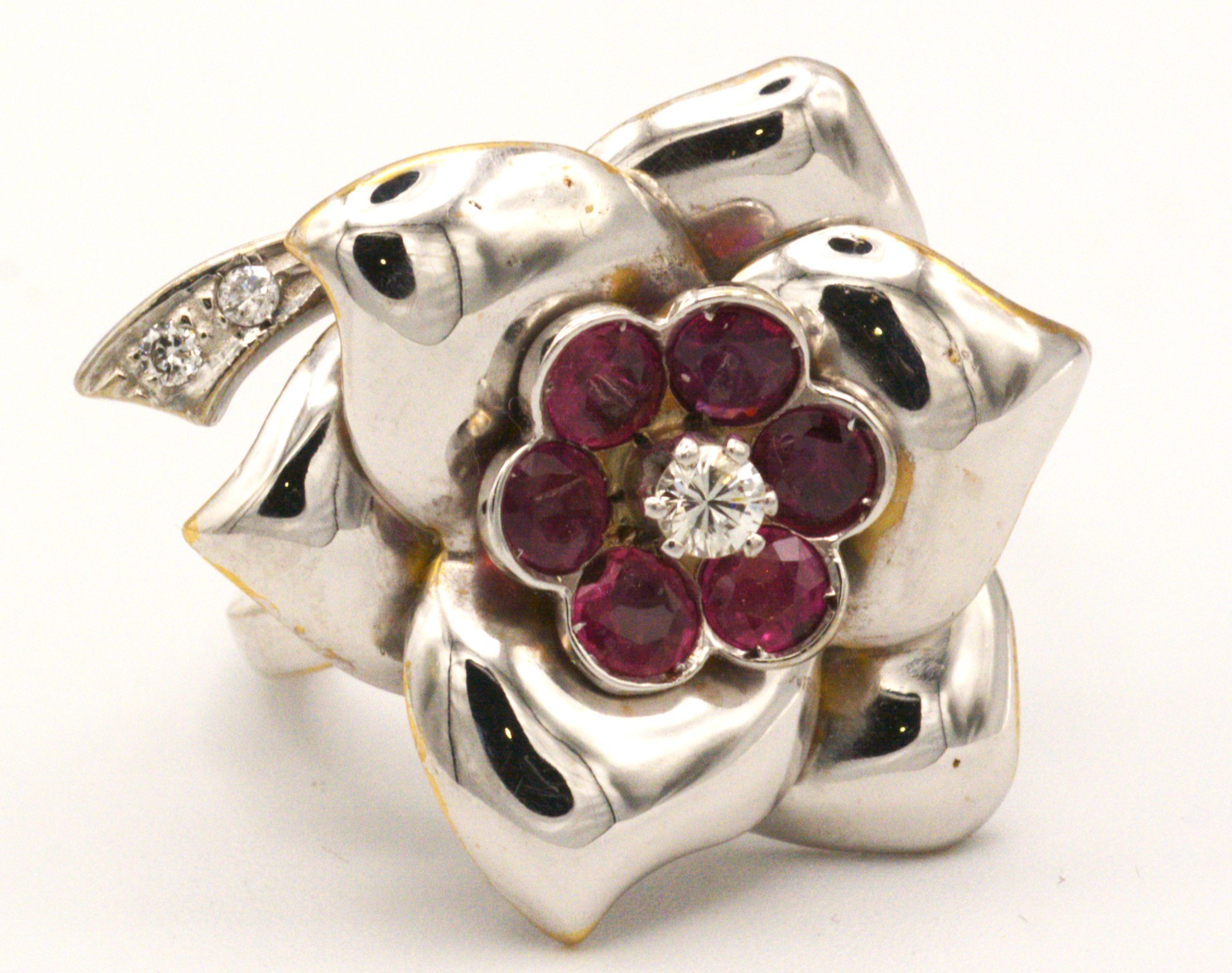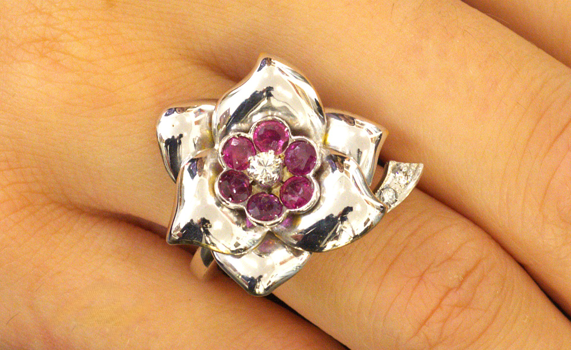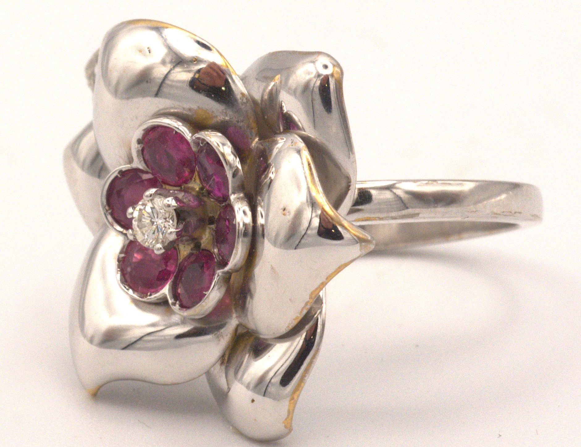 Anello rubini e brillante centrale, oro bianco 18 Kt